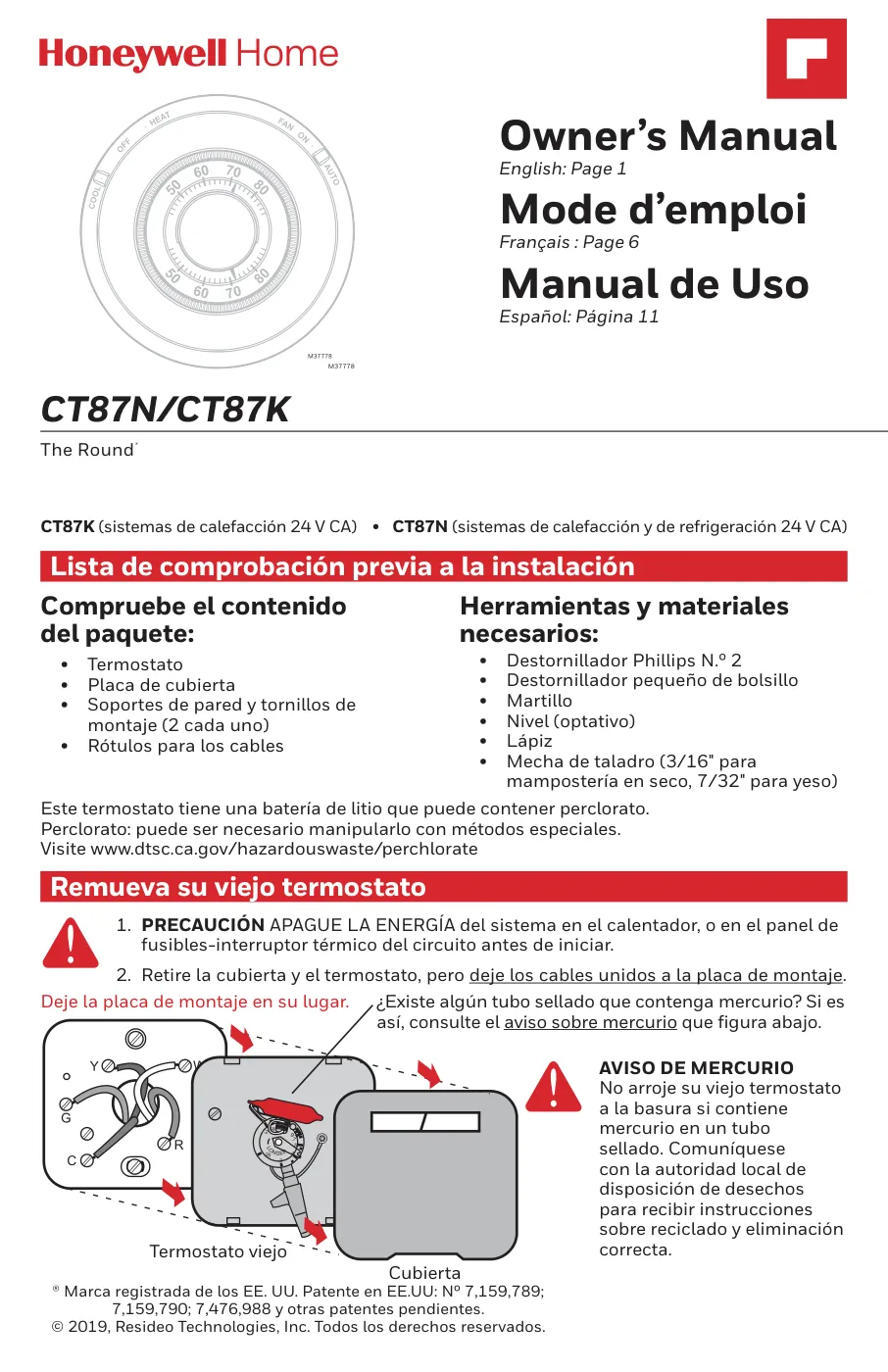Nota sobre perclorato: Este termostato puede contener una batería de litio que a su vez contiene perclorato. Visita www.dtsc.ca.gov/hazardouswaste/perchlorate para obtener información sobre manipulación especial si es necesario.