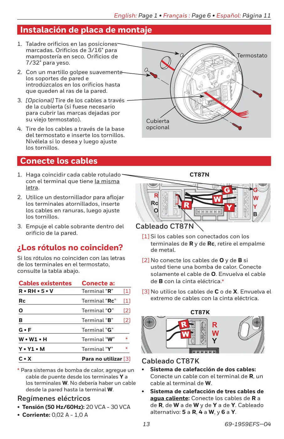 - Conecta los cables a los terminales correspondientes (R, W, Y).
