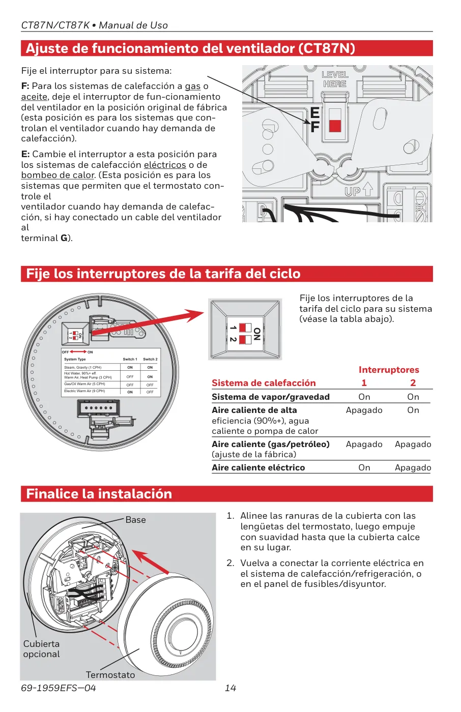 - Posición F (Gas/Aceite): El termostato controla el ventilador solo cuando hay demanda de calefacción (ajuste de fábrica).