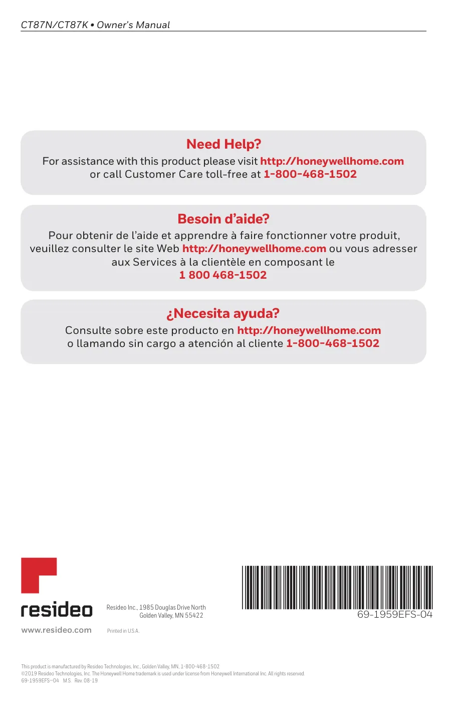 Tu termostato Honeywell The Round CT87N/CT87K cuenta con una garantía de 2 años contra defectos de fabricación. Para obtener asistencia, visita http://honeywellhome.com o llama al Servicio de Atención al Cliente sin cargo al 1-800-468-1502.